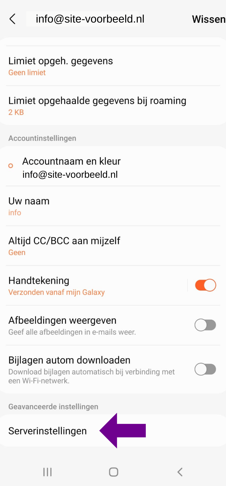 Bij sommige Android-toestellen krijg je nu de optie om extra opties te kiezen voor het e-mailaccount en om de account-naam en afzendernaam op te geven.