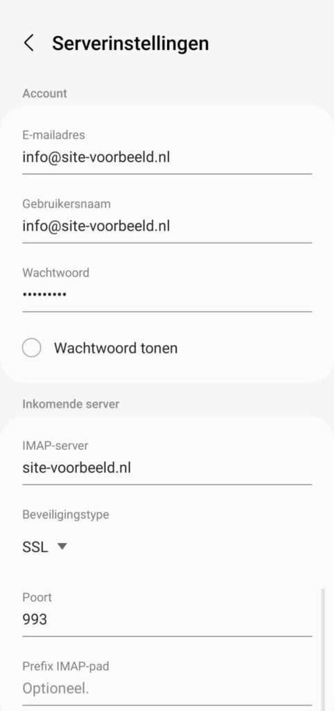 Vervolgens voer je de instellingen voor de inkomende server in.